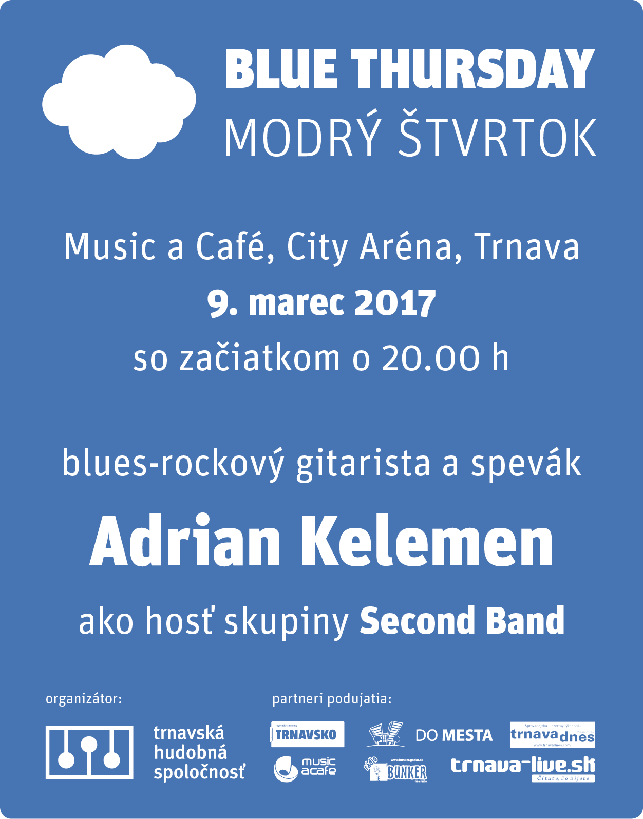 Desiatym pokračovaním úspešnej klubovej série Modrých štvrtkov - Blue Thursday – z réžie Trnavskej hudobnej spoločnosti, o.z. a domácej bluesovej skupiny Second Band je večer s hosťom – spevákom, gitaristom, skladateľom ale aj jadrovým fyzikom - Adrianom Kelemenom. Trnavčania ho mohli zažiť v roku 2015 na medzinárodnom hudobnom festivale Blues Moods ako člena jeho domovskej skupiny Kiero Grande či ako hosťujúceho gitaristu v skupine The Joint Venture v roku 2016. Adrian so svojou skupinou Kiero Grande v Trnave absolvoval aj živú nahrávku pre Rádio Bunker. So svojou skupinou sa zúčastnil na jednom z najväčších európskych festivalov SZIGET v Maďarsku, na Slovensku získali v roku 2011 titul “Objav roku” udeľovaný Slovenskou bluesovou spoločnosťou. Vzácne na skupine je hlavne to, že významné ocenenia získali už ako mladí muzikanti. Adrian sa autorsky podieľal na prvom samostatnom CD skupiny a mnohých ďalších kompilačných nahrávkach.