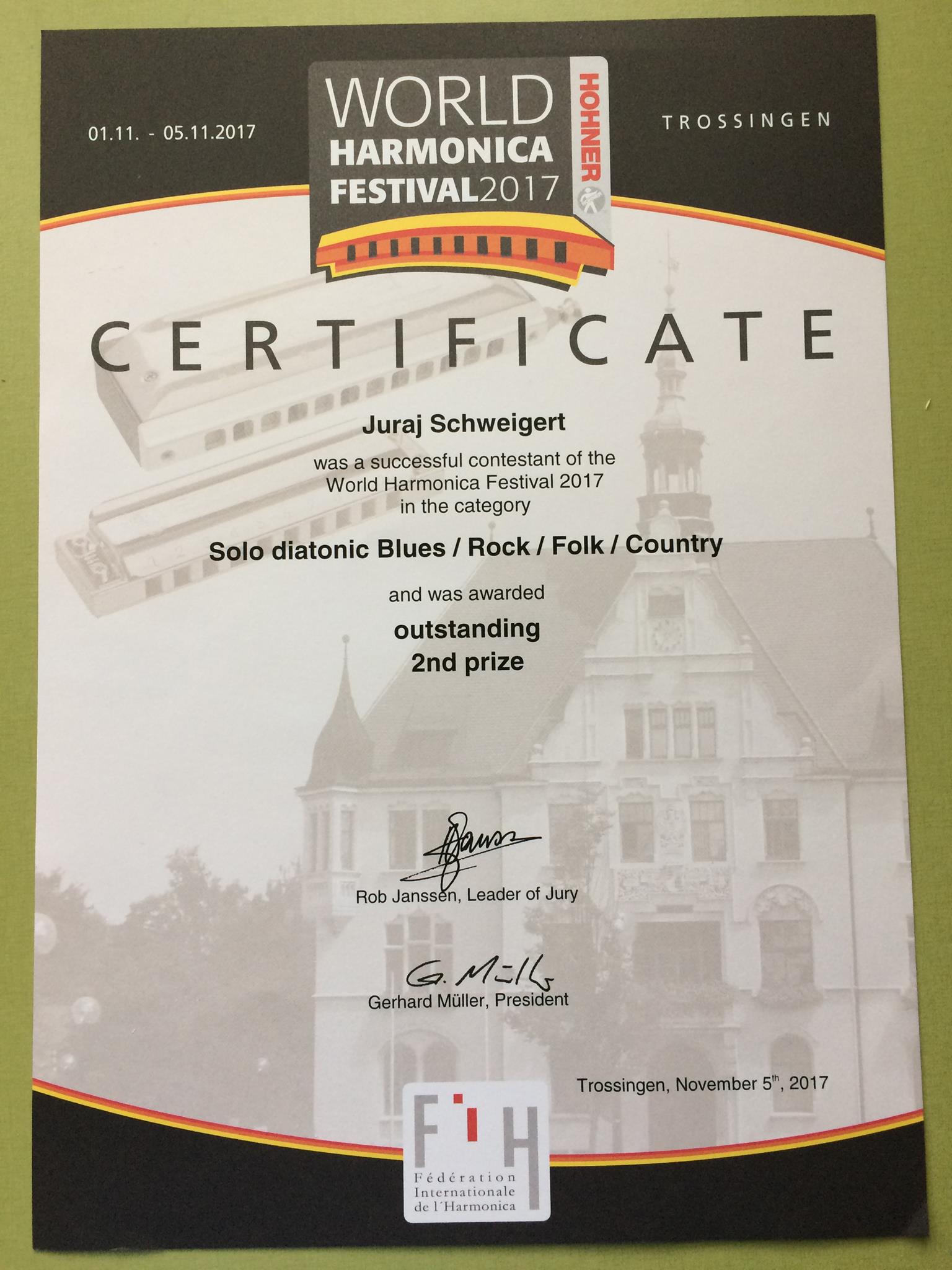 Wow, slovenský harmonikár Juraj Schweigert ocenený 2.miestom v kategórii Blues / Rock / Folk / Country na predstížnom svetovom harmonikovom festivale World Harmonika Festival 2017. Prvé miesto v tej istej kategórii získal ukrajinský harmonikár Mykyta Kutovyi. Juraj Schweigert súťažil aj v kategórii Solo diatonic Jazz / Melody kde skončil na skvelom 5.mieste.