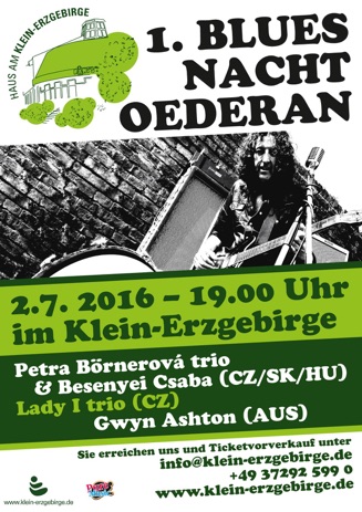 Festival pod názvom „Blues Nacht Oederan“ sa koná v krásnom prostredí parku miniaturných pamiatok Krušných hôr (Klein Erzgebirge). Festival zaháji medzinárodná zostava českej speváčky a akordenistky Petry Börnerovej so špeciálnym hosťom, maďarským harmonikárom Csabom Besenyeim. Po nich bude nasledovať obnovená komorněšia verzia legendárnej kapely Lady I trio v čele so speváčkou Eržikou Novotnou. Záver festivalu bude patriť celosvetovo uznávanému gitarovému virtuózovi Gwynovi Ashtonovi.