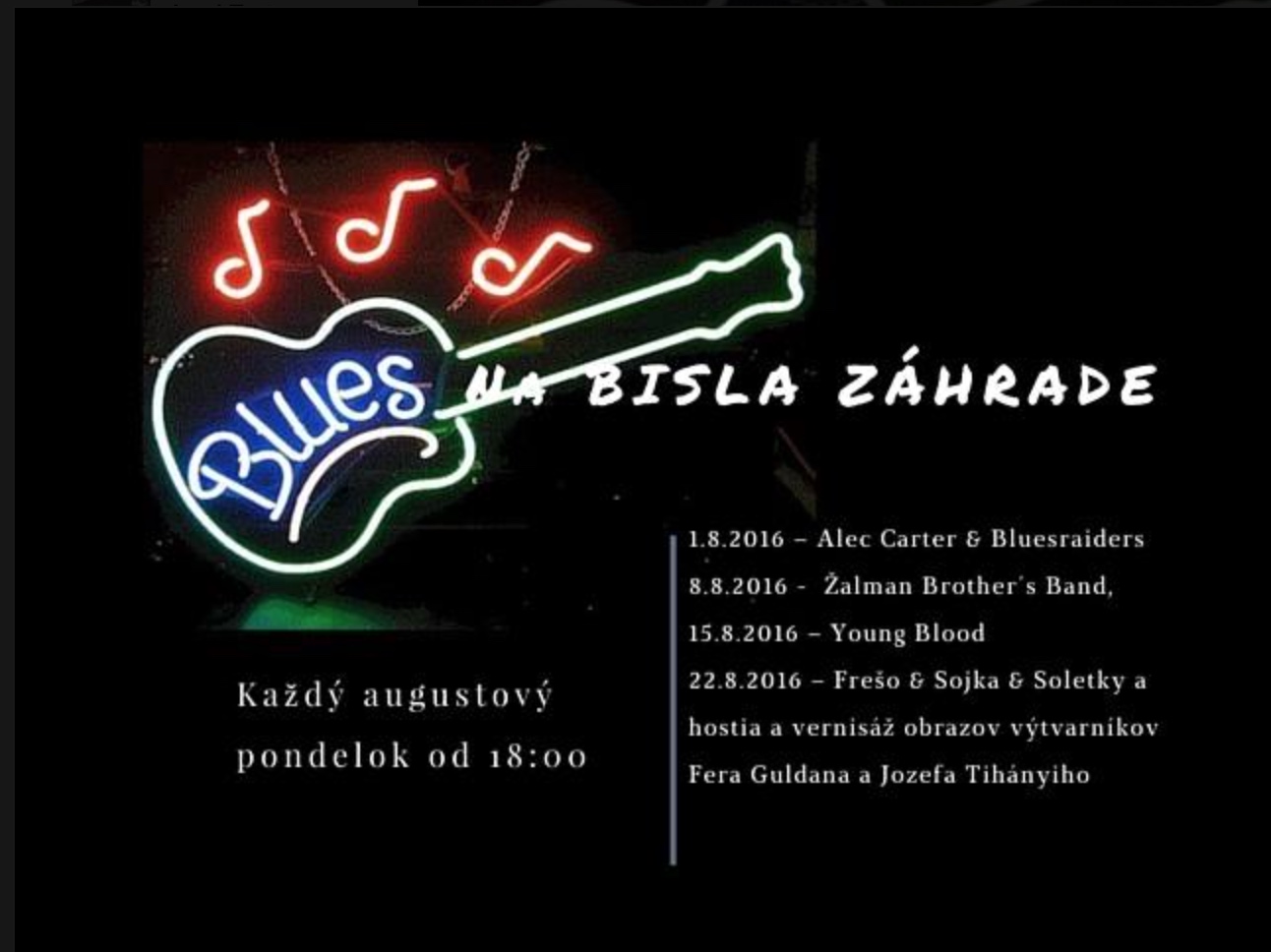 V roku 2015 Slovenskú bluesovú spoločnosť prichýlila na augustové koncerty po prvý raz bratislavská Univerzita BISLA, ktorá disponuje prekrásnou záhradou v srdci mesta, na Lazaretskej ulici. Odohrali sme tam päť perfektných koncertov v kultivovanom prostredí za veľkého záujmu obecenstva. Rok sa s rokom stretol, opäť je tu august, teda čas na minifestivalovú reprízu. Minuloročnú spoluprácu pozitívne ocenil aj rektor Univerzity BISLA, doc.Samuel Abrahám a tak aj s jeho tohtoročným súhlasom sa v altánku záhrady budú prezentovať nasledovné kapely: 1.8.2016 – Alec Carter & Bluesraiders, 8.8.2016 - Žalman Brother´s Band, 15.8.2016 – Young Blood a 22.8.2016 – Frešo & Sojka & Soletky, s prípadnými hosťami.