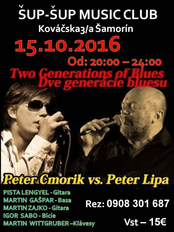 Šamorínsky music club Šup-Šupna Kováčskej ulici ponúka 15.10.2016 silný bluesový večer: Popový spevák s rockovými koreňmi Peter Cmorík a jazzman Peter Lipa budú hrať blues. Backovať ich budú skvelí: Martin Zajko - el.gitara, Martin Gašpar - basgitara, Pišta Lenbyel - el.gitara, Ajdži Sabo - bicie, Martin Wittgruber - klávesy