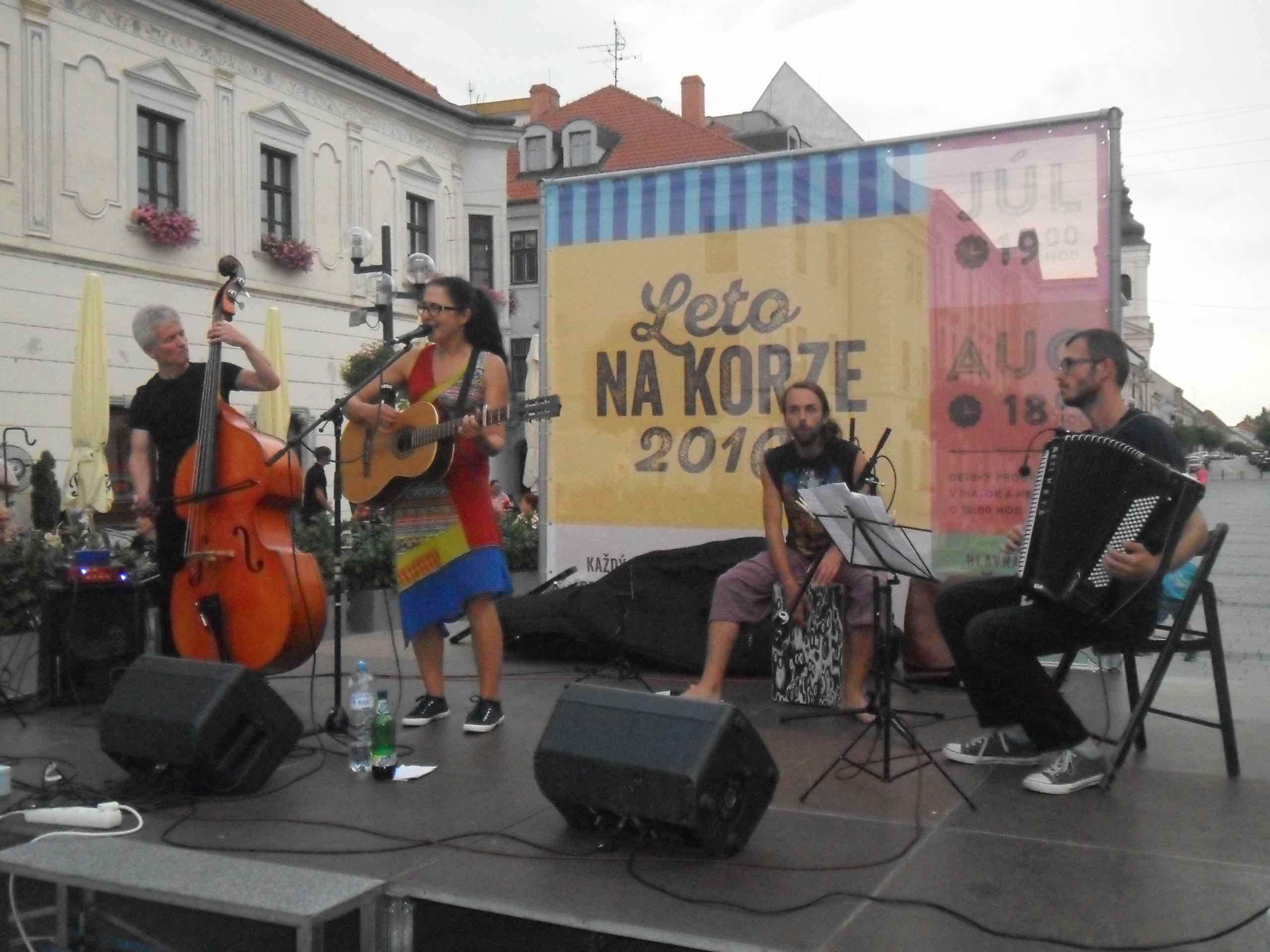 Vo štvrtok 21. júla som s radosťou cestovala do Trnavy. Tešila som sa na vystúpenie hudobného zoskupenia Romanika. Keď som prišla na seredskú železničnú stanicu, trochu s obavami som pozerala na tmavé mraky, ktoré vietor prinášal zo smeru, kam som mala namierené. No v Trnave som hneď zbadala, že tam nezapršalo. Dokonca spoza mrakov kde-tu vykúkalo slnko. Spokojne som šla po Hlavnej ulici pred radnicu, kde sa konajú aj počas týchto prázdnin rôzne kultúrne podujatia v rámci projektu Leto na korze. Na malom pódiu sa už na vystúpenie pripravovala Romanika – kontrabasista Roman Kraic a speváčka a gitaristka Ika Kraicová. Vlastne, nielen oni. Zostavu posilnili i akordeonista Martin Chovanec a perkusionista Rolo Uškovitš.